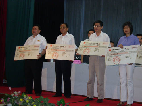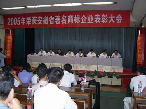 2006年7月26日下午,馬鞍山市2005年獲省著名商標(biāo)企業(yè)表彰大會在市政府東二樓會議室舉行,出席本 次會議的主要領(lǐng)導(dǎo)有省工商局副局長黃家華、市人大常委會副主任杜永田、市政府副市長劉榮華、市政協(xié) 副主席孫文植、市政府副秘書長王興無、省工商局商標(biāo)局局長劉國建等。
