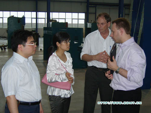 盡管天氣非常炎熱,下午還下起了暴雨,但這絲毫沒有影響他們參觀的熱情!稍作休息后,Peter和Daniel 就迫不及待的隨同公司領(lǐng)導及工作人員來到了我們的大型裝配車間,在這里,他們審視的眼光掃過每一臺機器,然后都滿意的點點頭。期間不斷的向隨行的工作人員提問,非常的認真,我們的工作人員都耐心的一一解答。