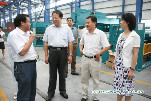 公司董事長鄭長玉向領(lǐng)導(dǎo)一行匯報了中德的發(fā)展歷程及目前的發(fā)展?fàn)顩r。重點介紹了我公司在車間管理和質(zhì)量監(jiān)督體制方面的完善工作,并從目前的發(fā)展局勢展望更好的發(fā)展前景。王司長也關(guān)切地向公司領(lǐng)導(dǎo)了解一些機器方面的情況,在聽到鄭董事長匯報說中德不會因目前的成績而有絲毫懈怠時,王司長滿意的點了點頭。參觀過大型裝配車間后,領(lǐng)導(dǎo)一行來到了成品車間,擺放在這里的一臺雙機聯(lián)動數(shù)控折彎機迅速地吸引了大家的眼球,鄭董事長向領(lǐng)導(dǎo)介紹說這臺機器已經(jīng)經(jīng)過商檢并即將發(fā)往波蘭并非常自豪地說這位波蘭客商正是看中了中德的實力才會放心的與我們合作。隨后公司總經(jīng)理鄭小平向領(lǐng)導(dǎo)介紹了目前中德的國外代理點及國外銷售情況,表示中德還有非常大的外貿(mào)發(fā)展空間。