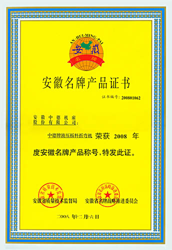 中德牌液壓板料折彎?rùn)C(jī)喜獲2008年“安徽省名牌產(chǎn)品”的殊榮,這是繼2005年中德牌液壓擺式剪板機(jī)獲“安徽名牌產(chǎn)品”之后,中德機(jī)床的質(zhì)量和信譽(yù)又一次獲得認(rèn)可。與此同時(shí),中德牌液壓擺式剪板機(jī)也順利通過(guò)安徽名牌產(chǎn)品的復(fù)審,證書(shū)的有效期將延長(zhǎng)至2013年。