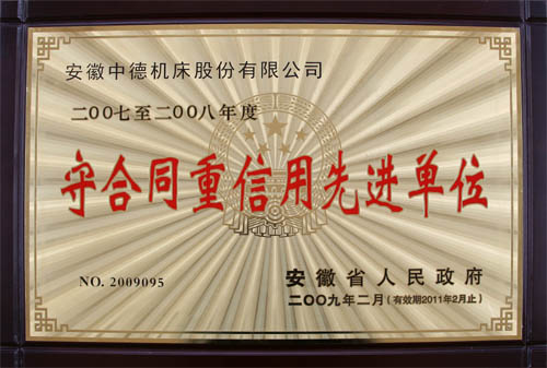 近日,我公司榮獲由安徽省人民政府頒發(fā)的二〇〇七至二〇〇八年度“守合同重信用先進(jìn)單位”榮譽(yù)稱(chēng)號(hào)(證書(shū)號(hào):2009095,有效期止2011年2月),也是我公司第二次獲得此項(xiàng)殊榮。