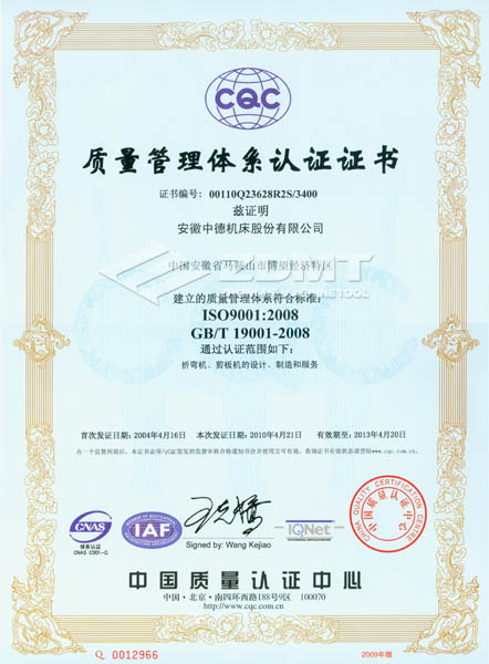 2010年4月,我公司順利通過了ISO 9001:2008版換證復(fù)審,獲得認(rèn)證證書(證書編號:00110Q23628R2S/3400)。在此次復(fù)審過程中,中國質(zhì)量認(rèn)證中心(CQC)對我公司的質(zhì)量體系運行情況進行了全方位嚴(yán)格審核,并對中德公司質(zhì)量管理工作給予了充分的肯定。